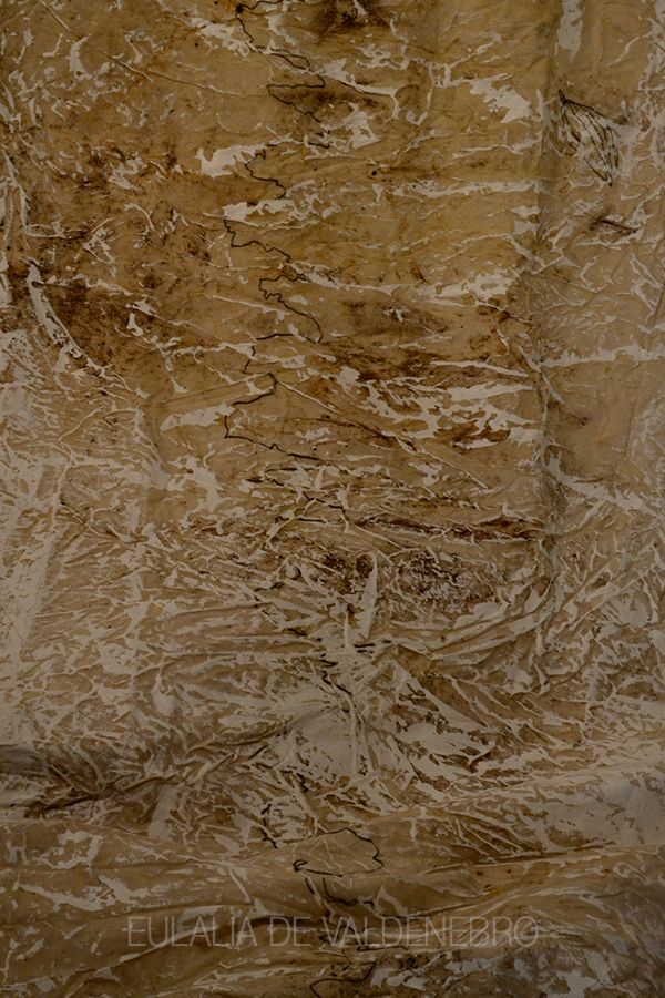 Encontrar los cultivos de cacao (objetivo de la residencia) implicaba atravesar el río nadando. Esa condición determinó los materiales del registro. Recurrí así al concepto de la huella y la escala 1:1, pues ellos dan cuenta del encuentro de cuerpos heterogéneos, de una relación local y táctil que se da en la experiencia. Recurro también a la idea de pliegue, pues en las residencias siempre enfrento el problema de transportar el registro logrado, así que plegar se ha convertido en un recurso plástico asociado a la expedición y al desplazamiento. Llevé entonces dos telas. En una de ellas calco el rastro que el agua dejó en la tela en el trayecto al atravesar el río, y en la otra dibujo las sombras que proyectaba un cacao al mediodía. La intención en ambos casos fue hacer un mapeo de las relaciones locales de esos árboles de cacao. En ellas recolecté y transporté algunas muestras vegetales de los cultivos. Al volver al taller, resalté los pliegues con pintura blanca, apelando de esta manera al lecho de mármol de Río Claro, en donde todas las relaciones entre agua, vida, humanos y cacaos circulan con especial fuerza.